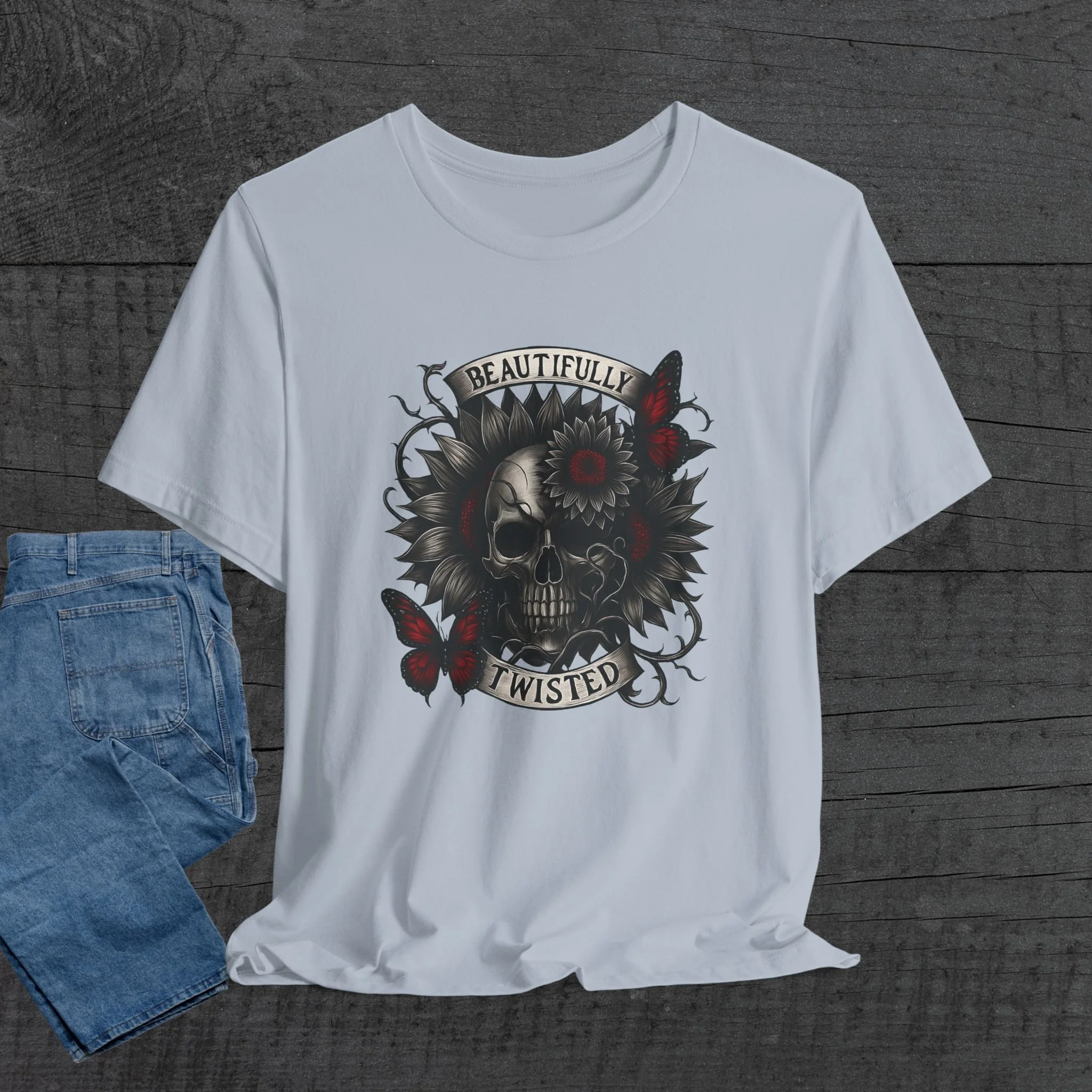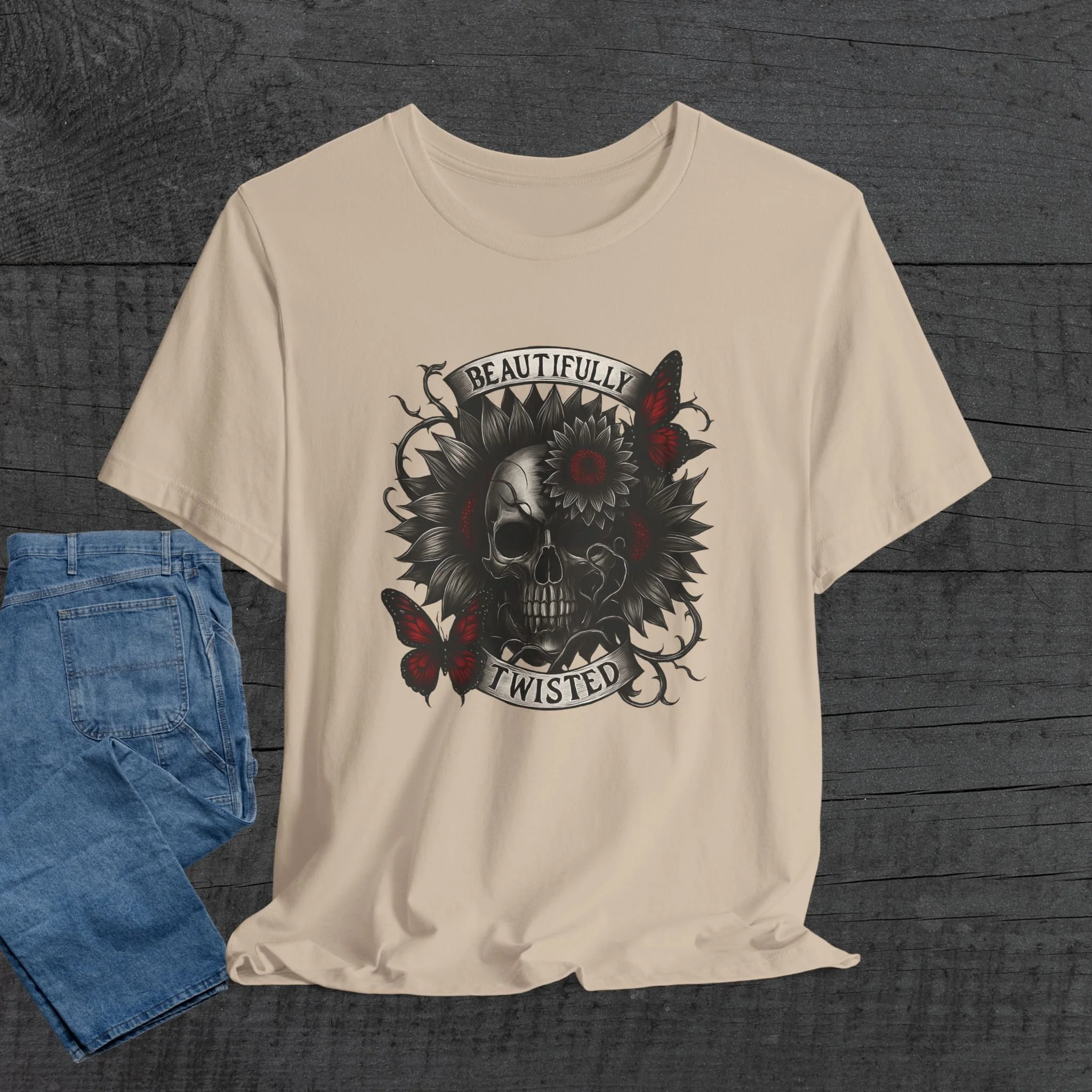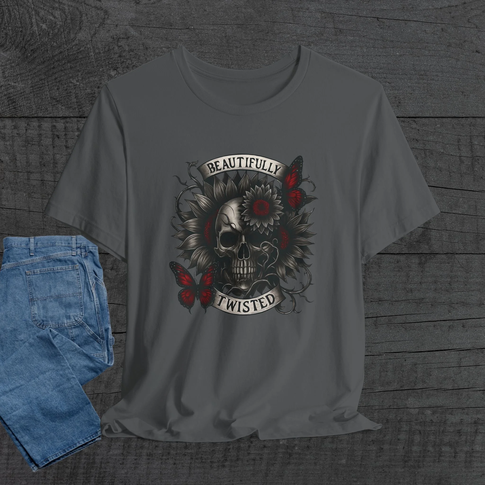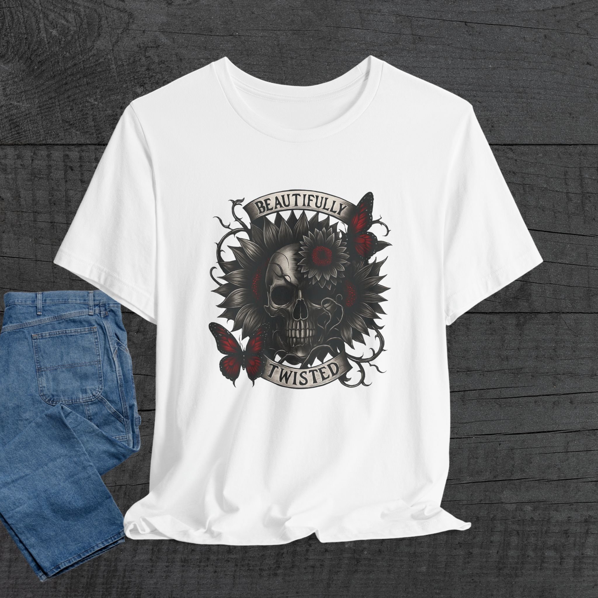 Beautifully Twisted Skull Shirt – Gothic Sunflower Tee, Dark Aesthetic Butterfly Design