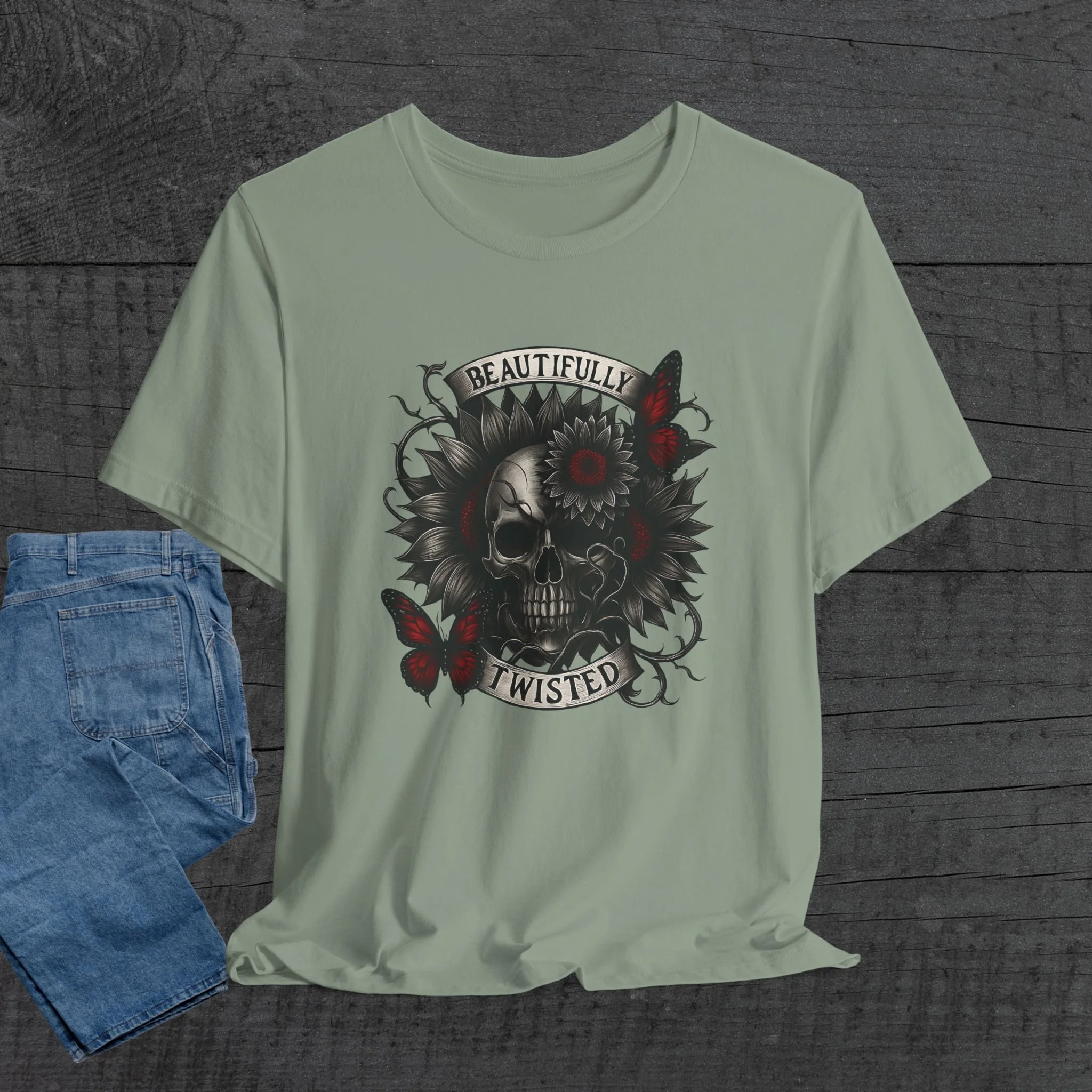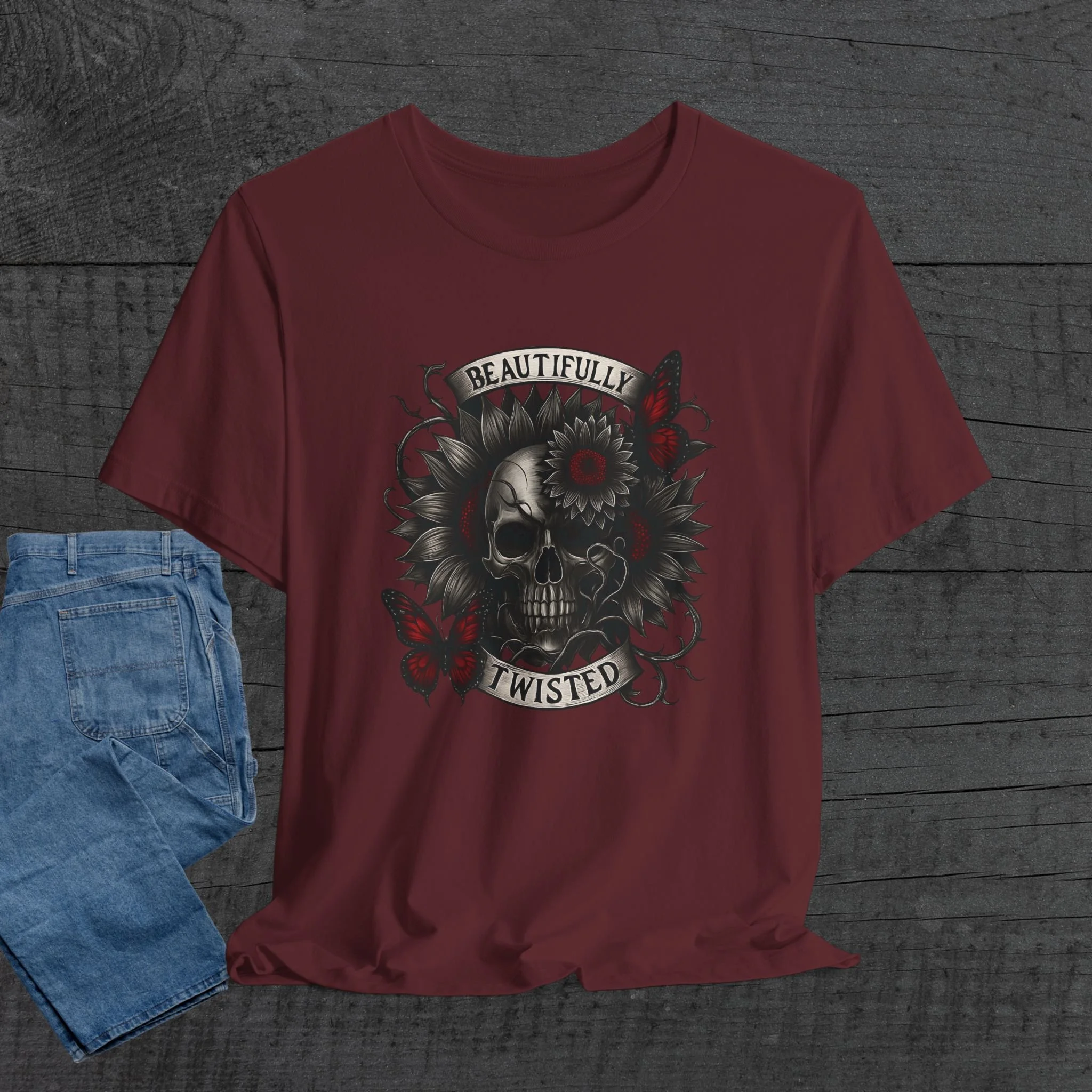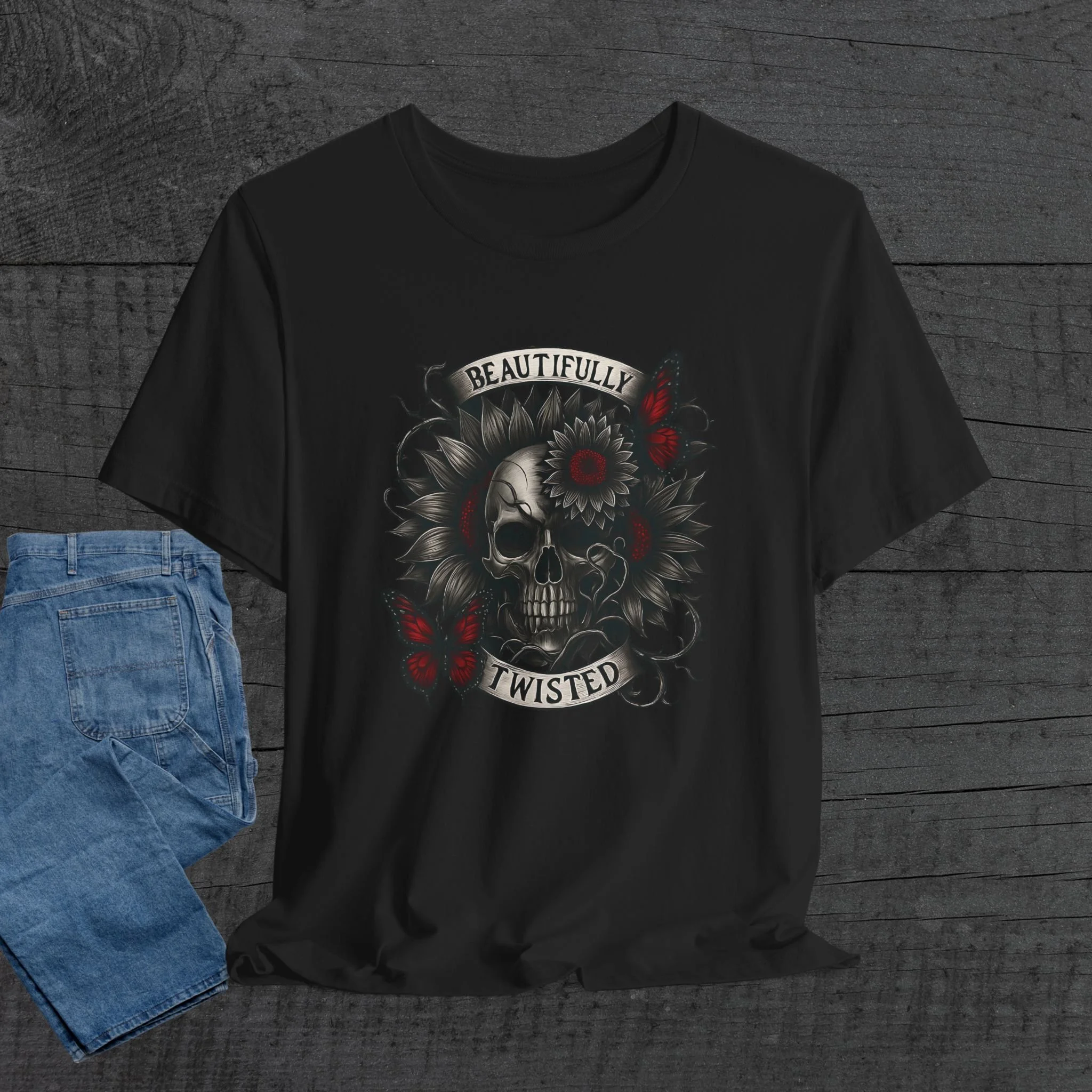 Embrace your dark side with this Beautifully Twisted Skull Shirt, blending gothic elegance with bold symbolism. Featuring a haunting skull surrounded by black sunflowers and striking red butterflies, this design is perfect for anyone who loves dark aesthetics, alternative fashion, or beautifully eerie artwork.