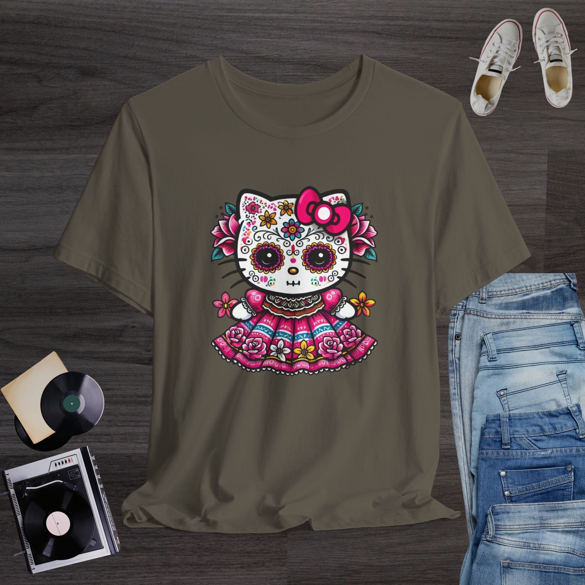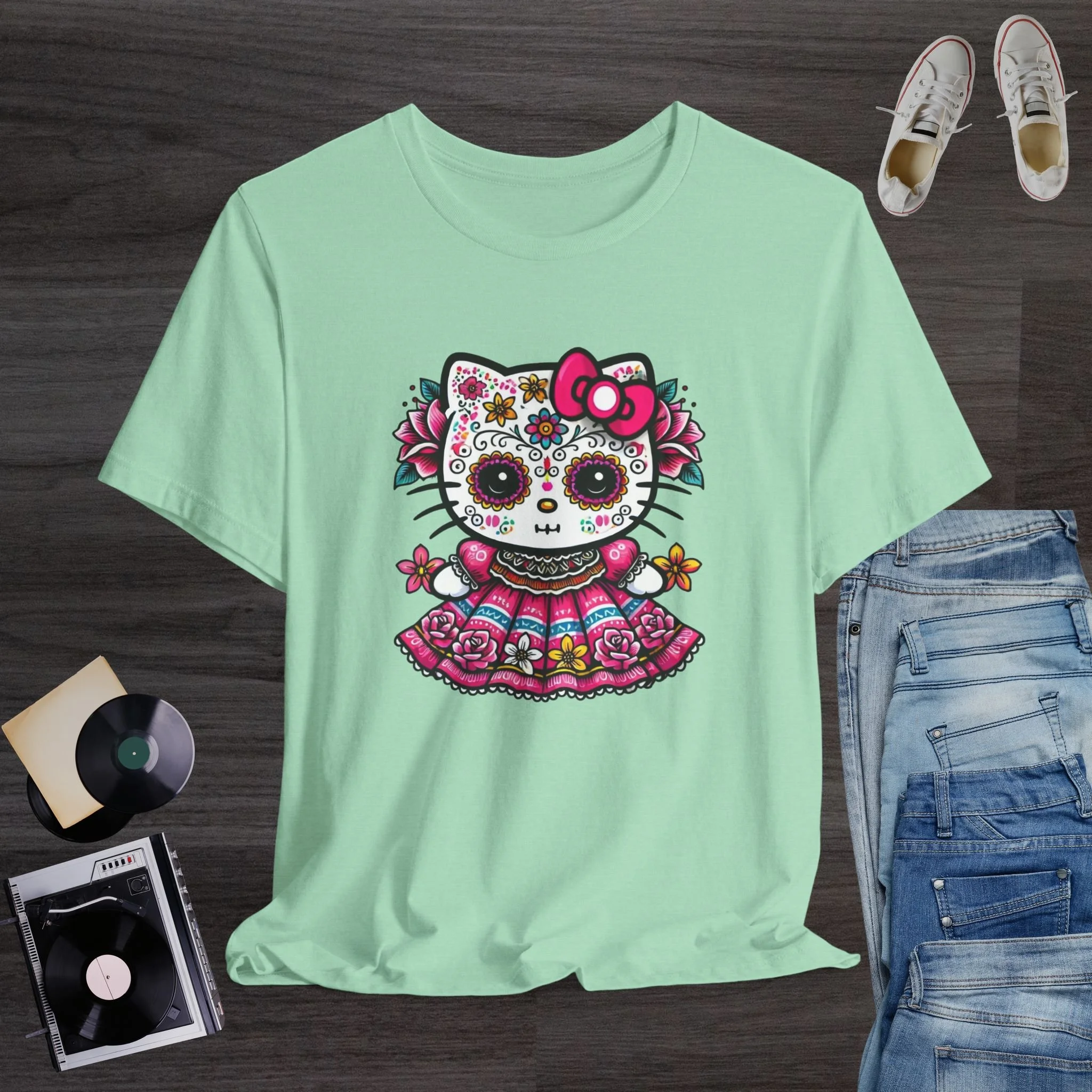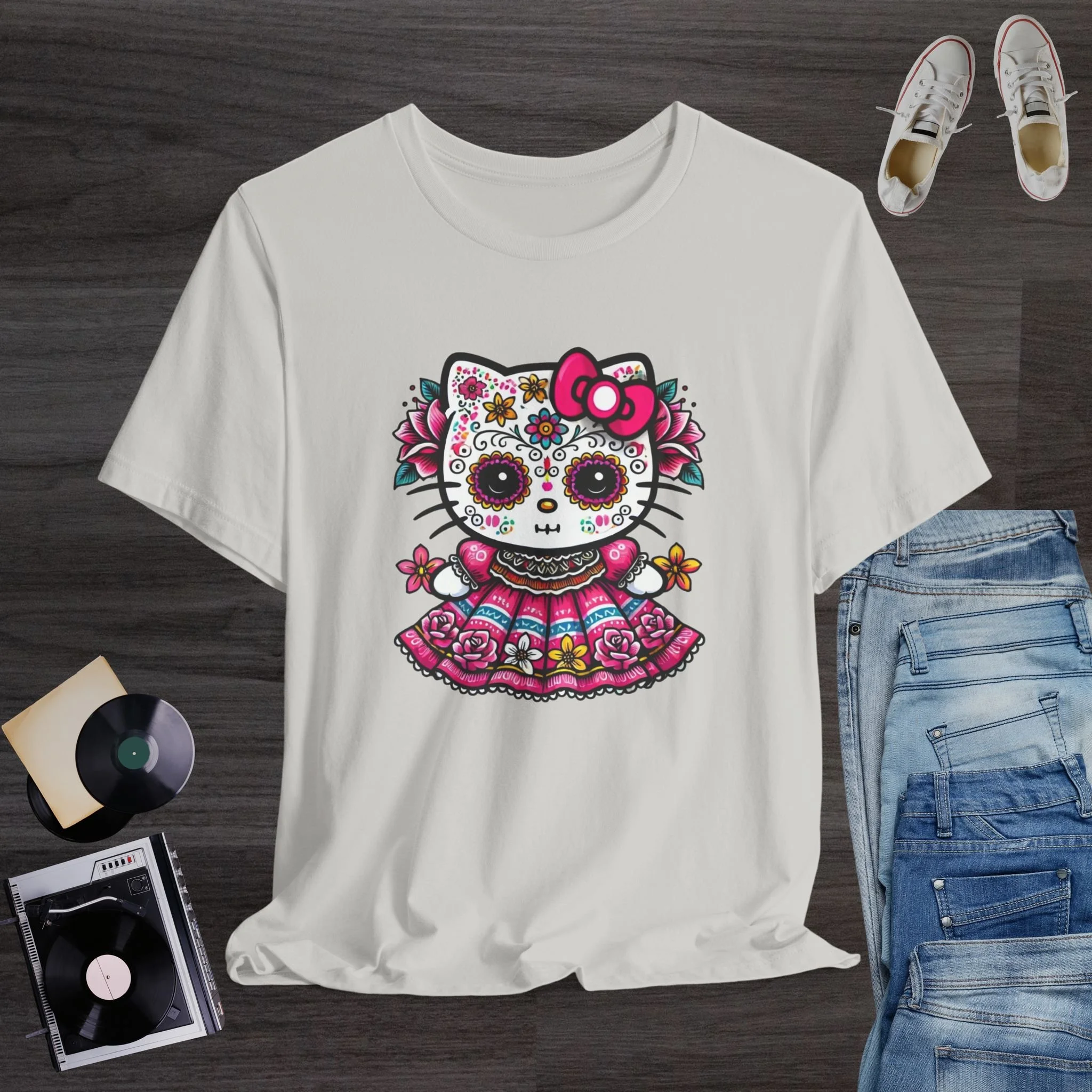 Celebrate the beauty of Día de los Muertos with this stunning and colorful sugar skull kitty T-shirt! Featuring a cute hello kitty decorated with traditional Day of the Dead face paint, vibrant flowers, and an ornate folkloric dress, this design blends cultural charm with kawaii sweetness. The bright pinks, yellows, and blues create a striking and festive look perfect for Día de los Muertos events, fall celebrations, Hispanic Heritage Month, and lovers of bold, artistic fashion. Printed on a soft and comfortable tee, it’s a meaningful and eye-catching piece for anyone who appreciates Mexican culture, floral artwork, and unique holiday designs.