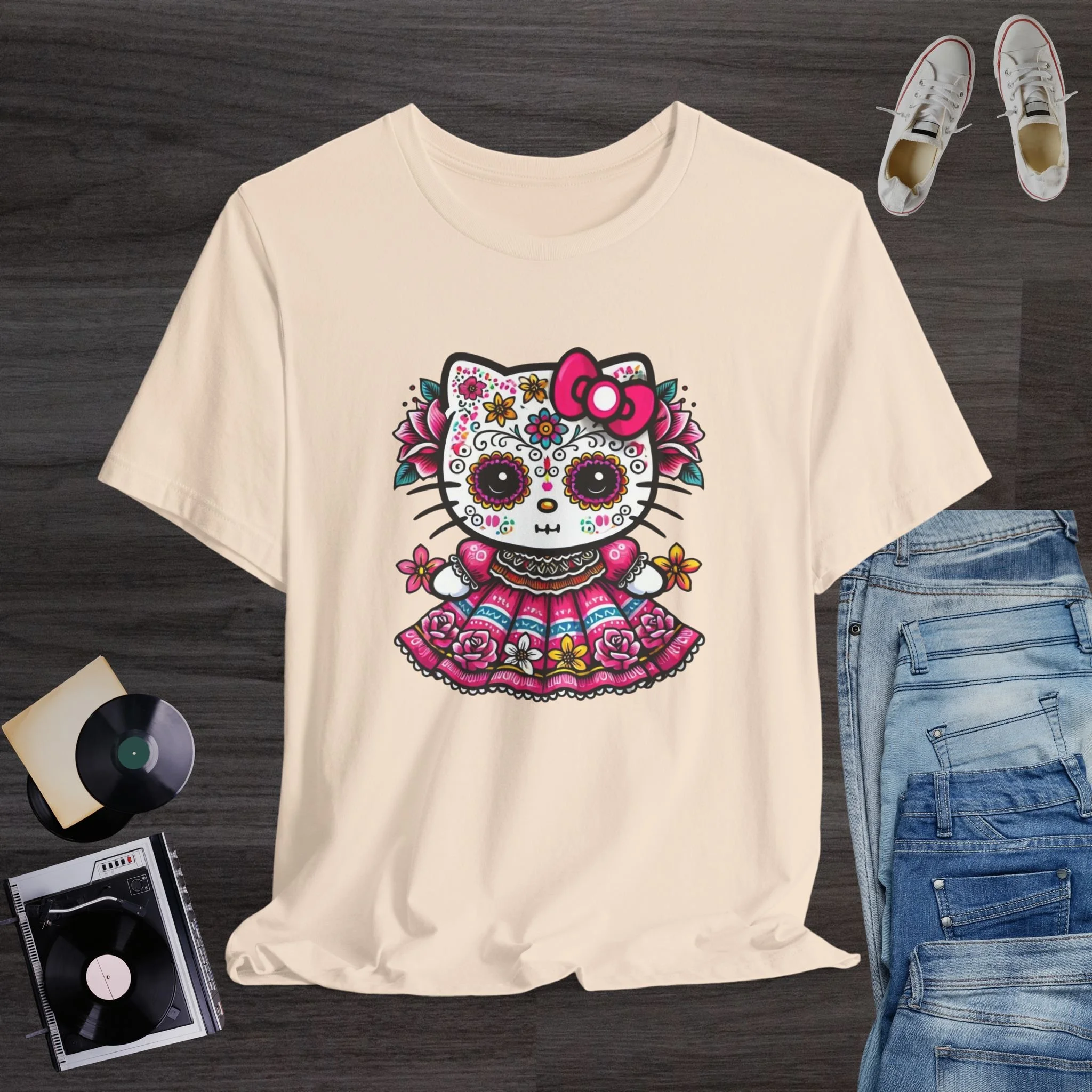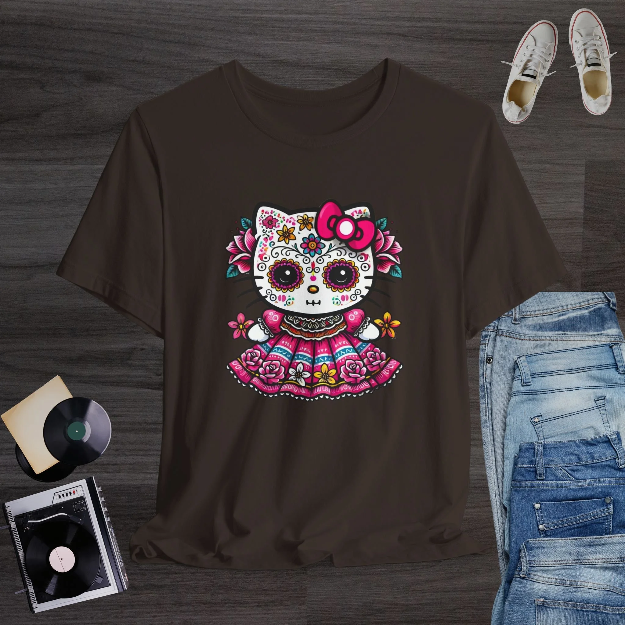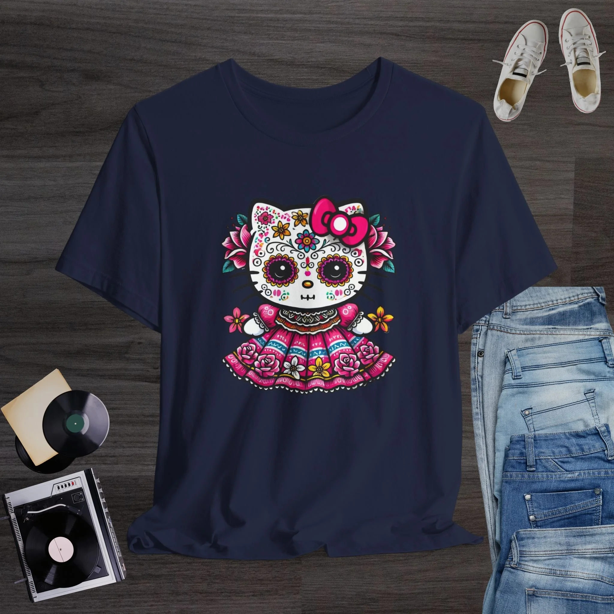 Celebrate the beauty of Día de los Muertos with this stunning and colorful sugar skull kitty T-shirt! Featuring a cute hello kitty decorated with traditional Day of the Dead face paint, vibrant flowers, and an ornate folkloric dress, this design blends cultural charm with kawaii sweetness. The bright pinks, yellows, and blues create a striking and festive look perfect for Día de los Muertos events, fall celebrations, Hispanic Heritage Month, and lovers of bold, artistic fashion. Printed on a soft and comfortable tee, it’s a meaningful and eye-catching piece for anyone who appreciates Mexican culture, floral artwork, and unique holiday designs.