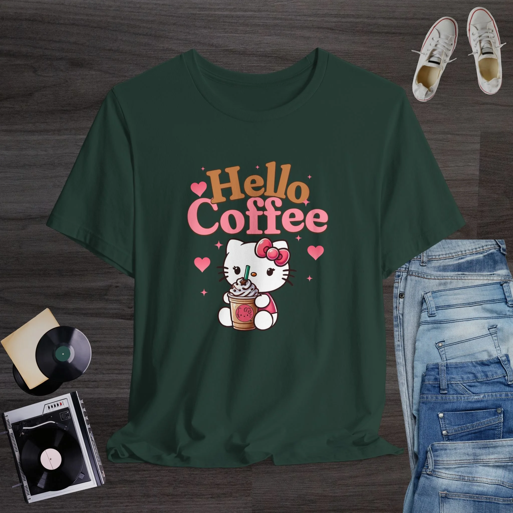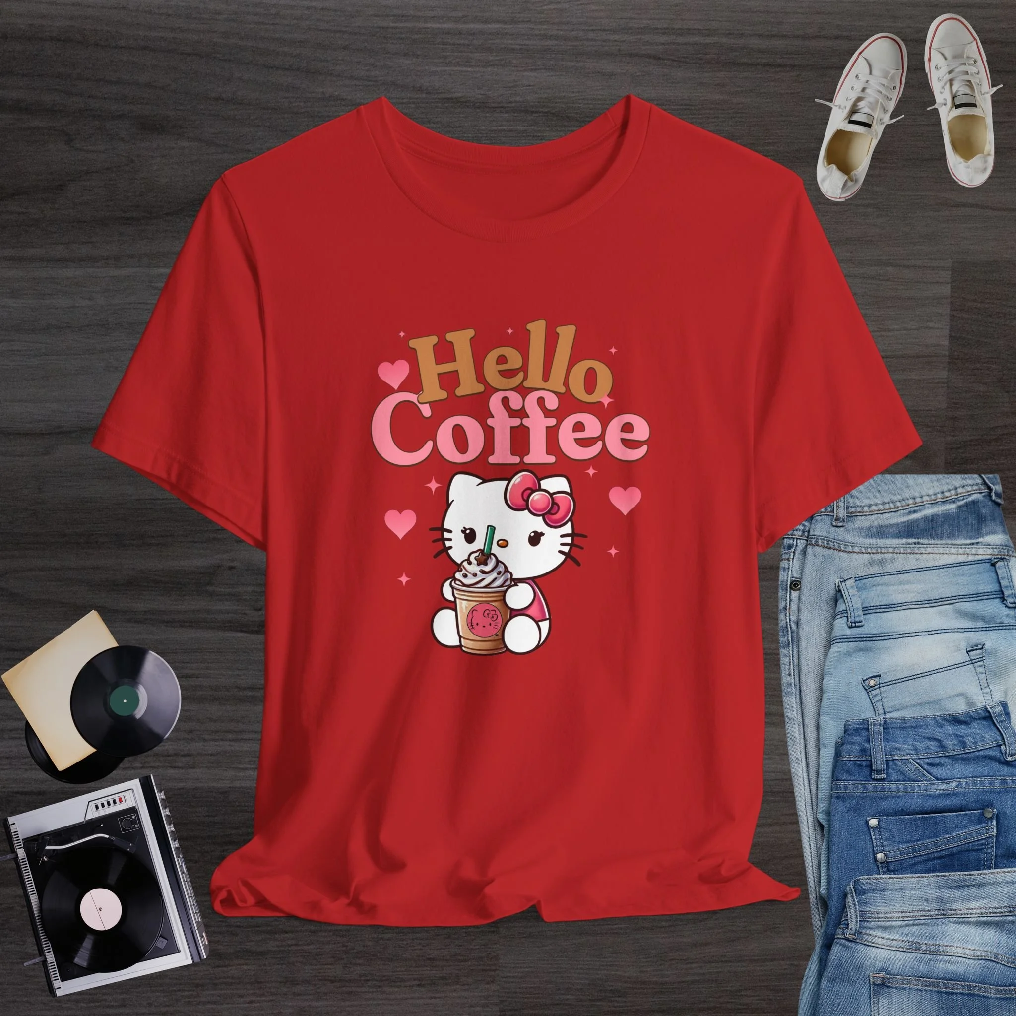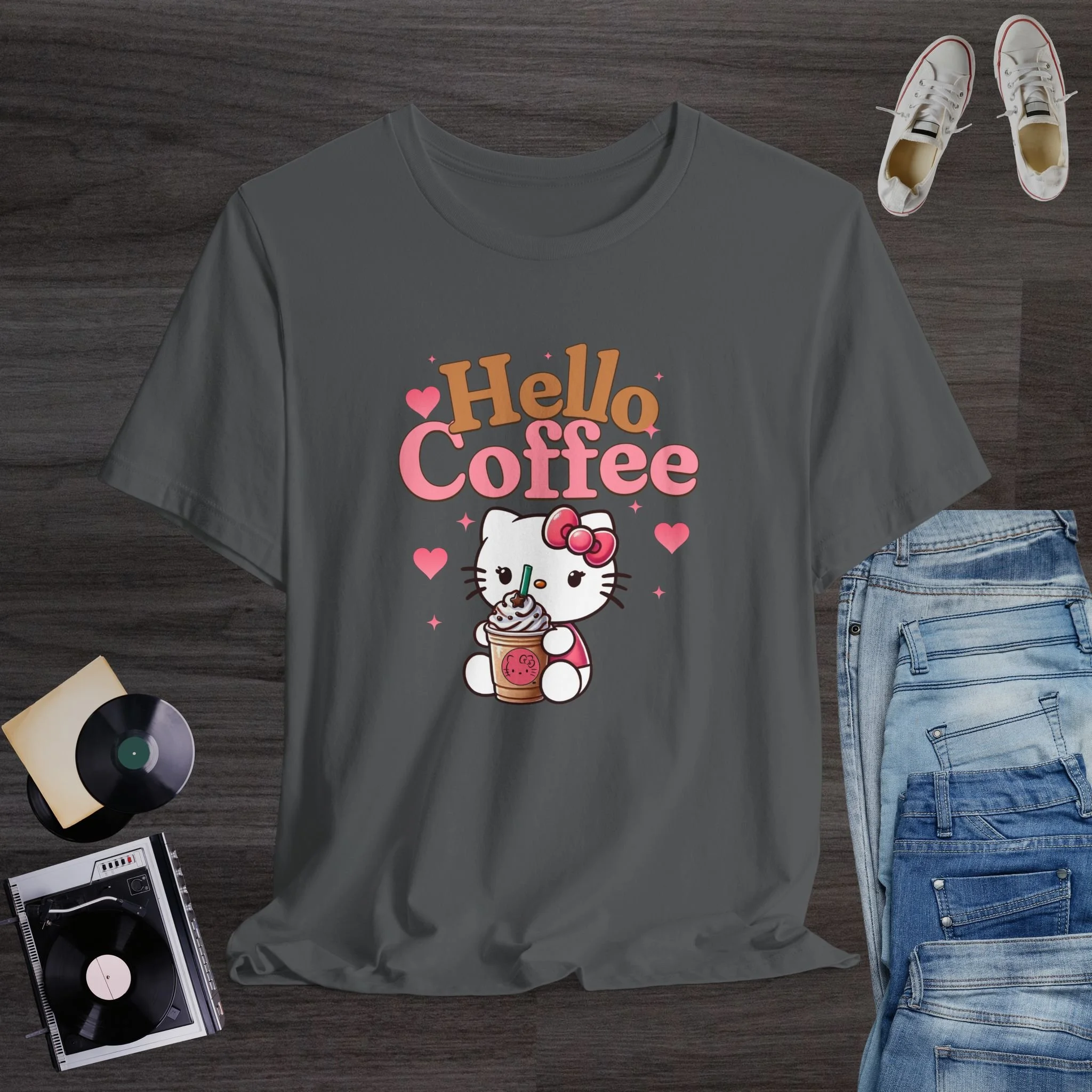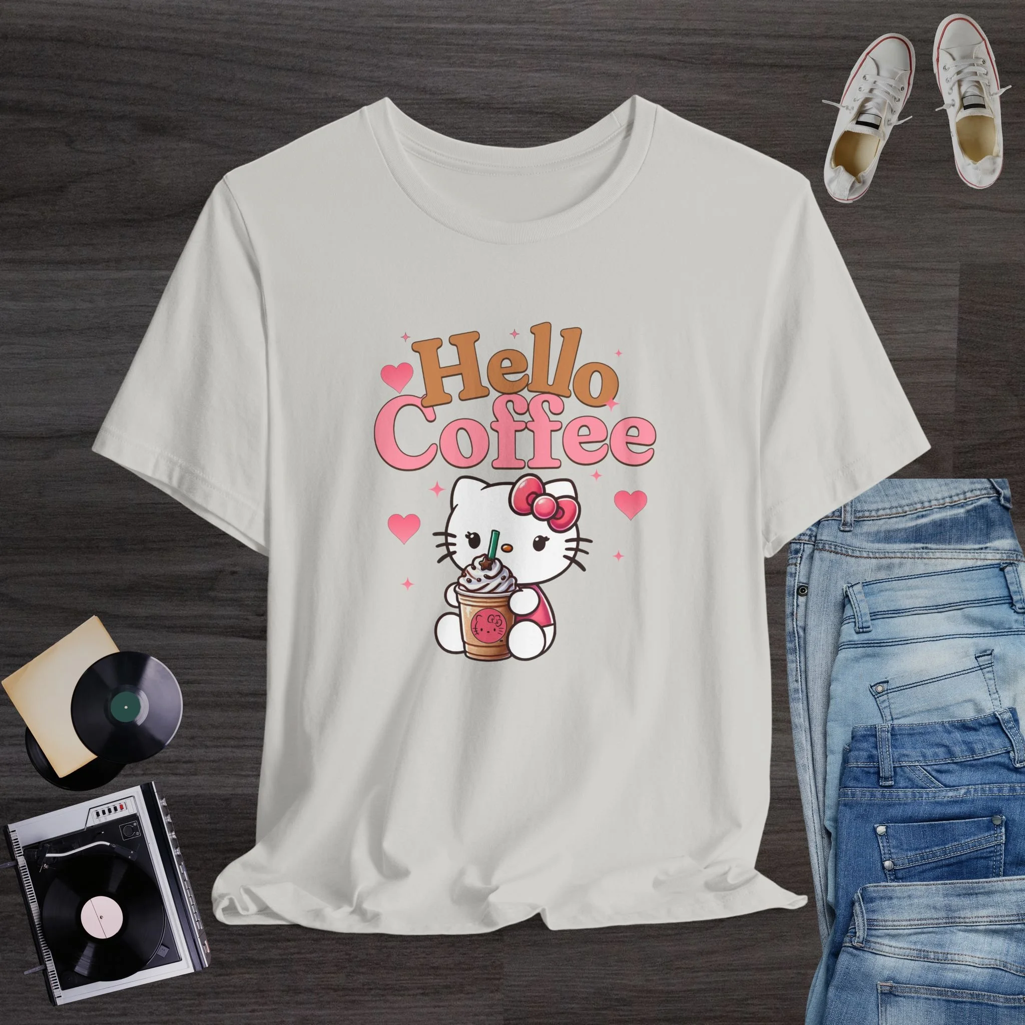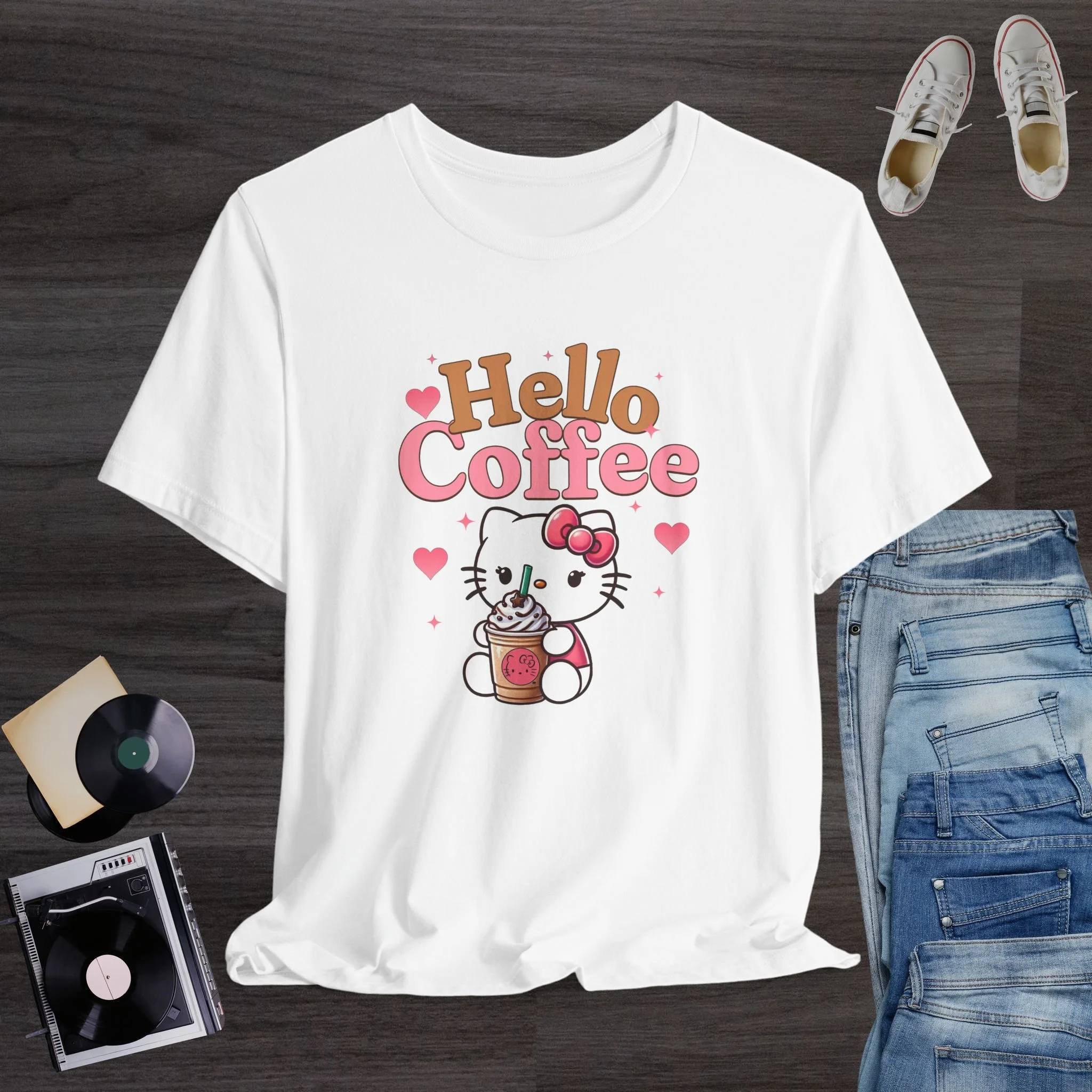 Cute Kitty Coffee Lover T-Shirt | “Hello Coffee” Pink Aesthetic Graphic Tee