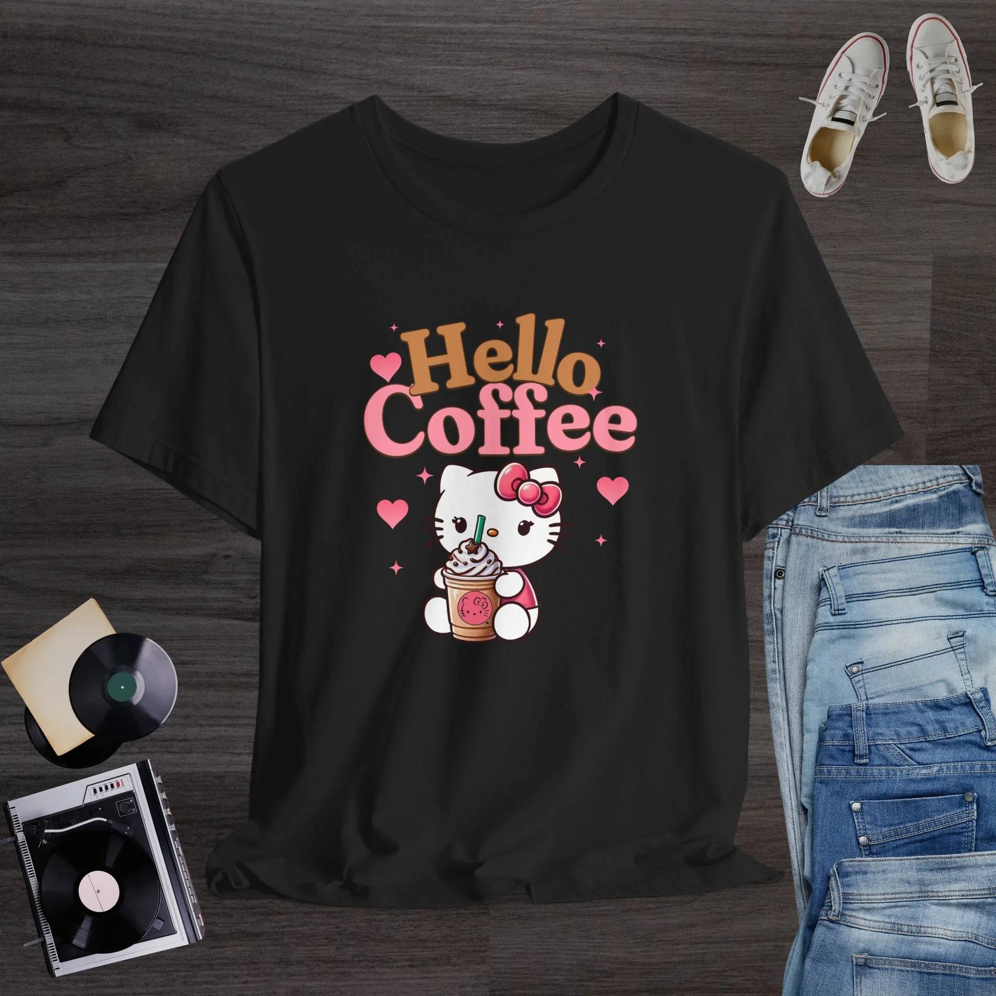 Start your day with cuteness and caffeine! This adorable “Hello Coffee” T-shirt features Hello Kitty holding a whipped coffee drink surrounded by hearts and soft pastel accents. Perfect for coffee lovers, cute aesthetic fans, and anyone obsessed with cozy morning vibes, this tee combines playful charm with a clean, modern look. Printed on a soft and comfy shirt, it’s ideal for everyday wear, gifting, or adding a little extra happiness to your morning routine. A must-have for coffee addicts, kawaii fashion lovers, and pink aesthetic enthusiasts!