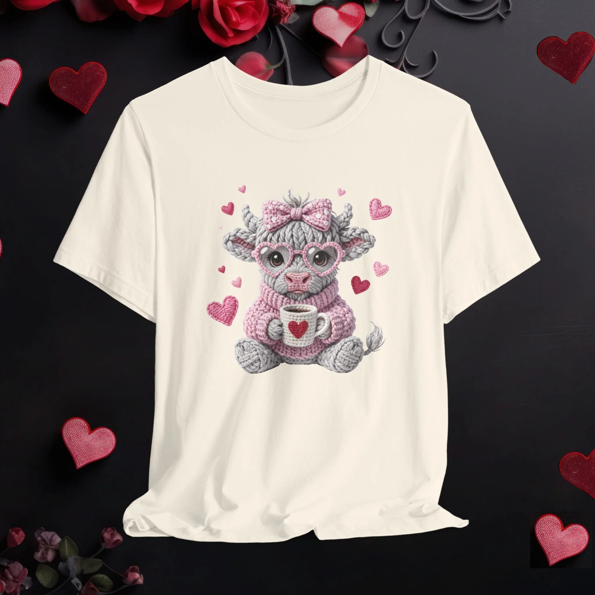 Cute Valentine Faux Yarn Cow Shirt – Pink Faux Crochet Coffee Cow Graphic Tee