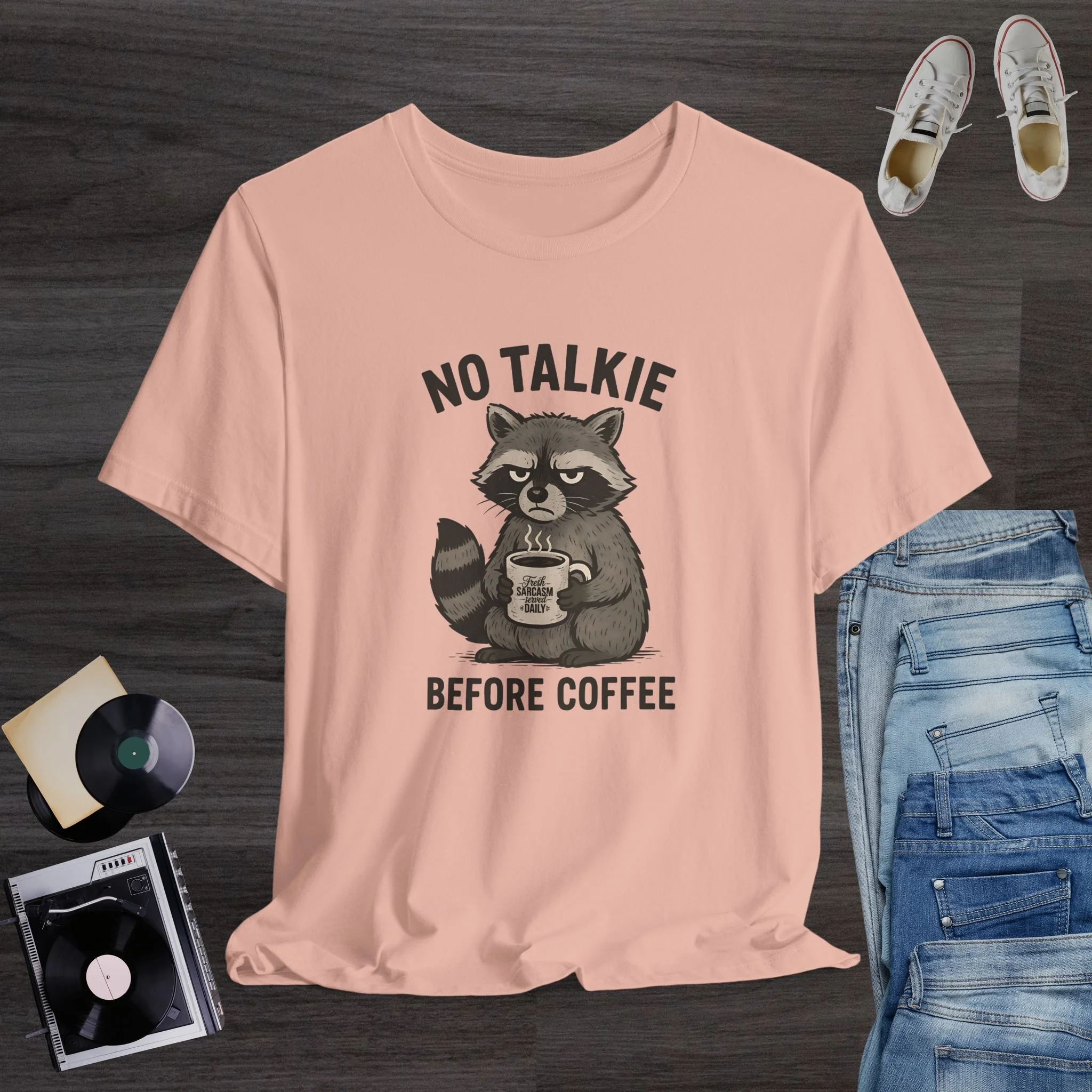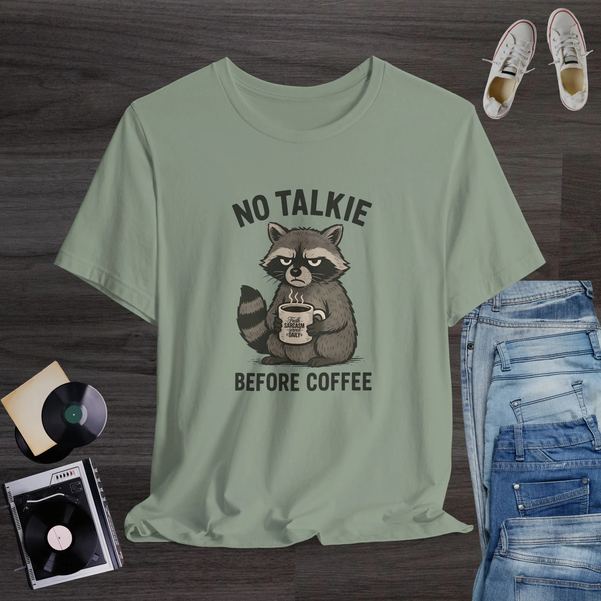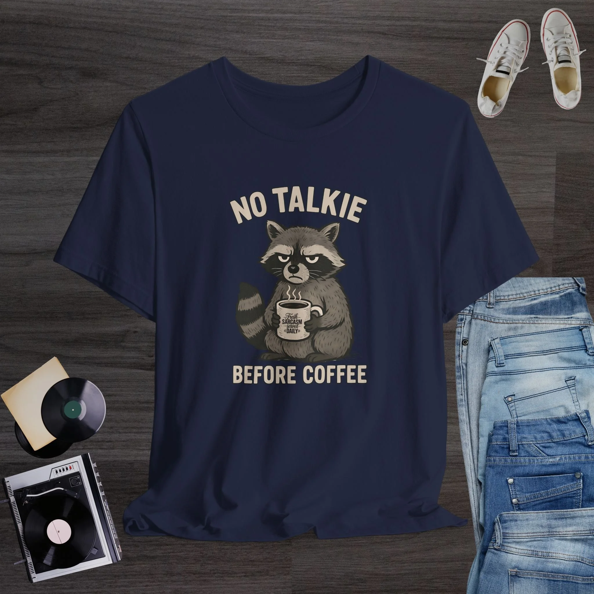 Funny Raccoon Coffee T-Shirt | “No Talkie Before Coffee” Sarcastic Morning Tee