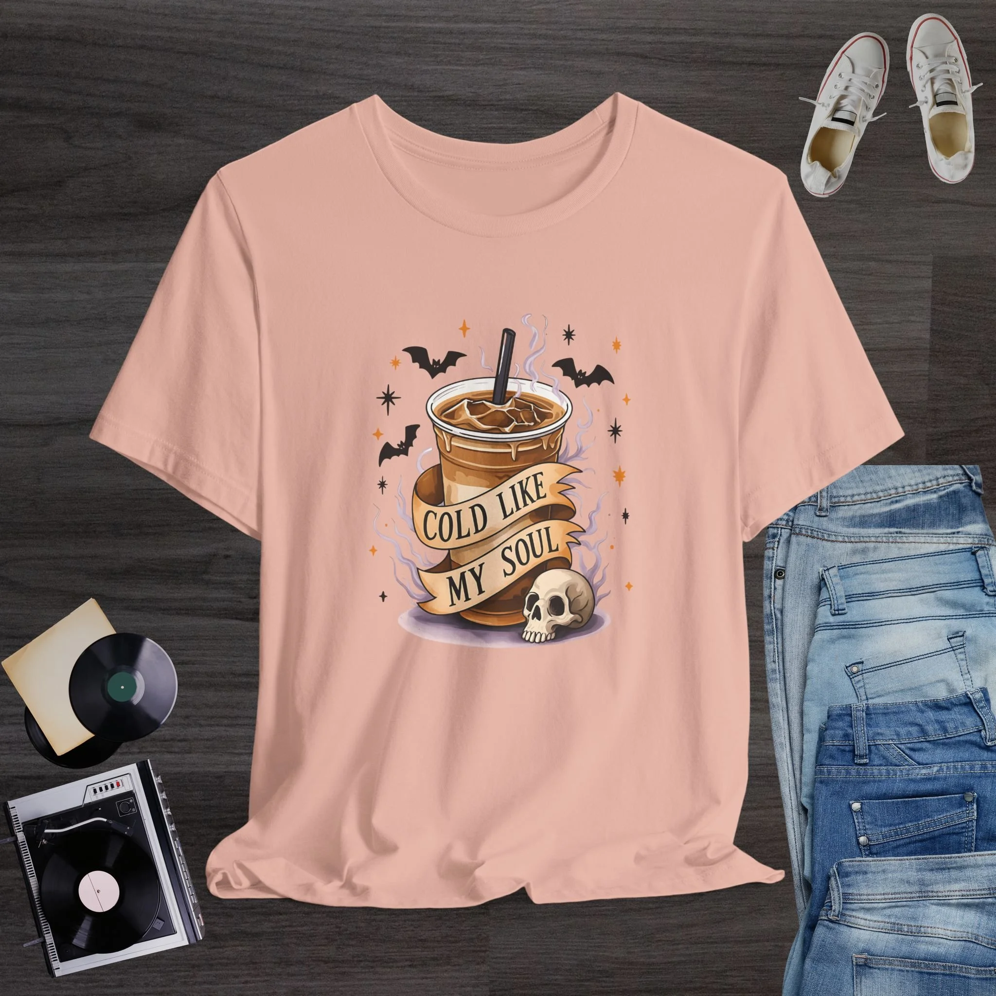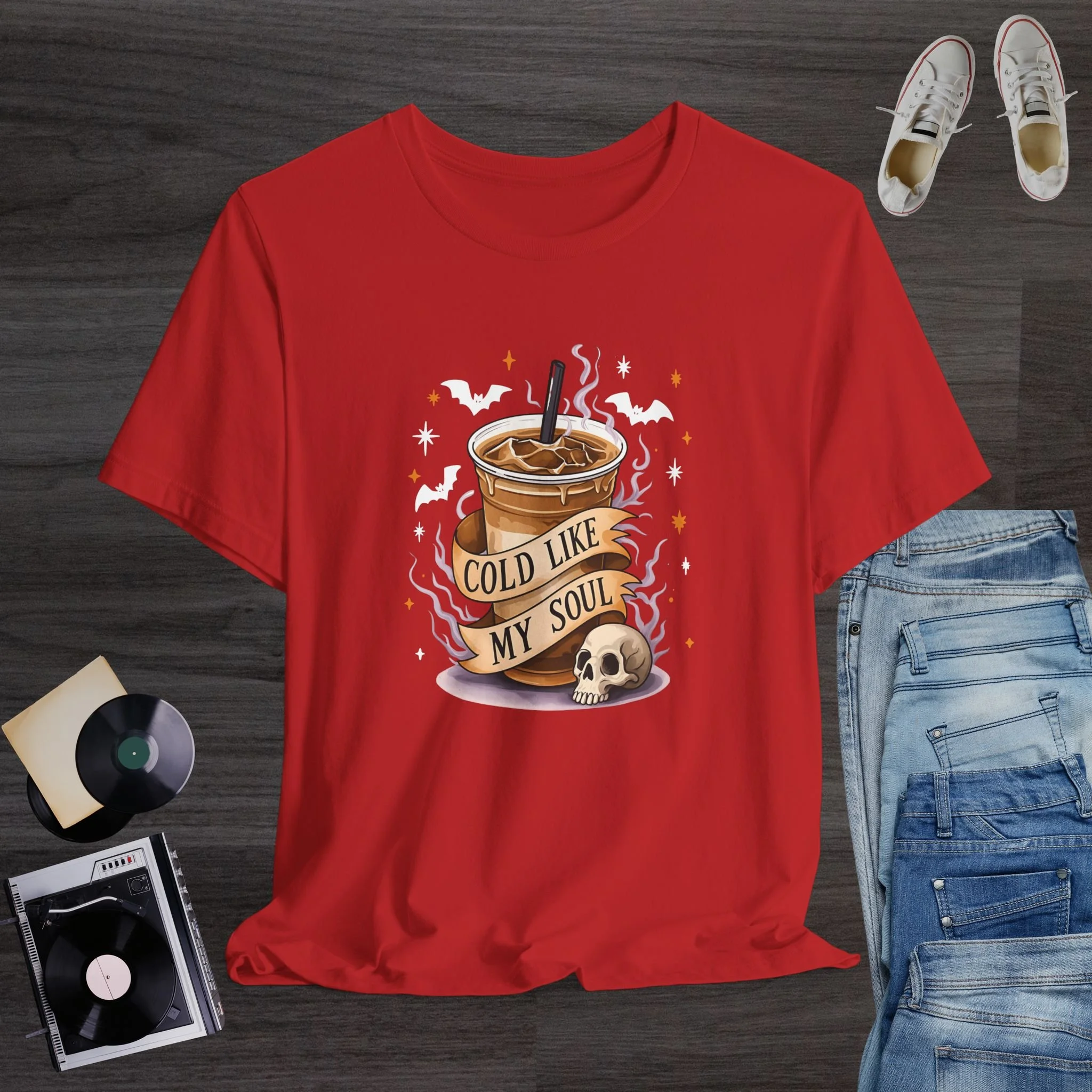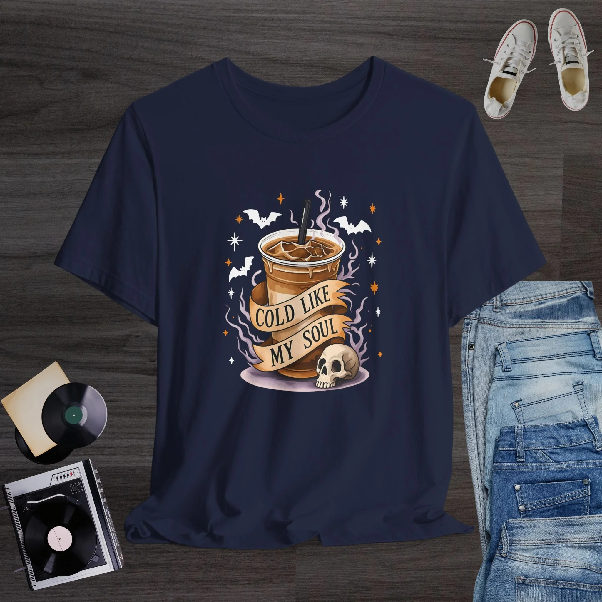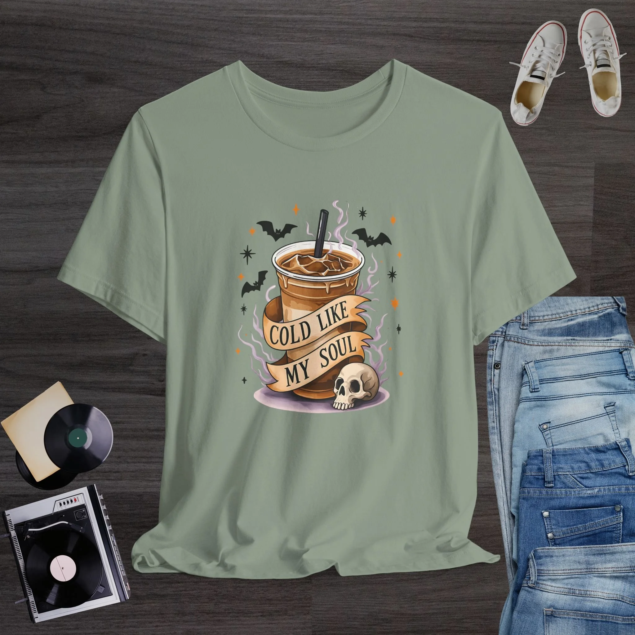 Goth Iced Coffee T-Shirt | “Cold Like My Soul” Dark Humor Skeleton Graphic Tee