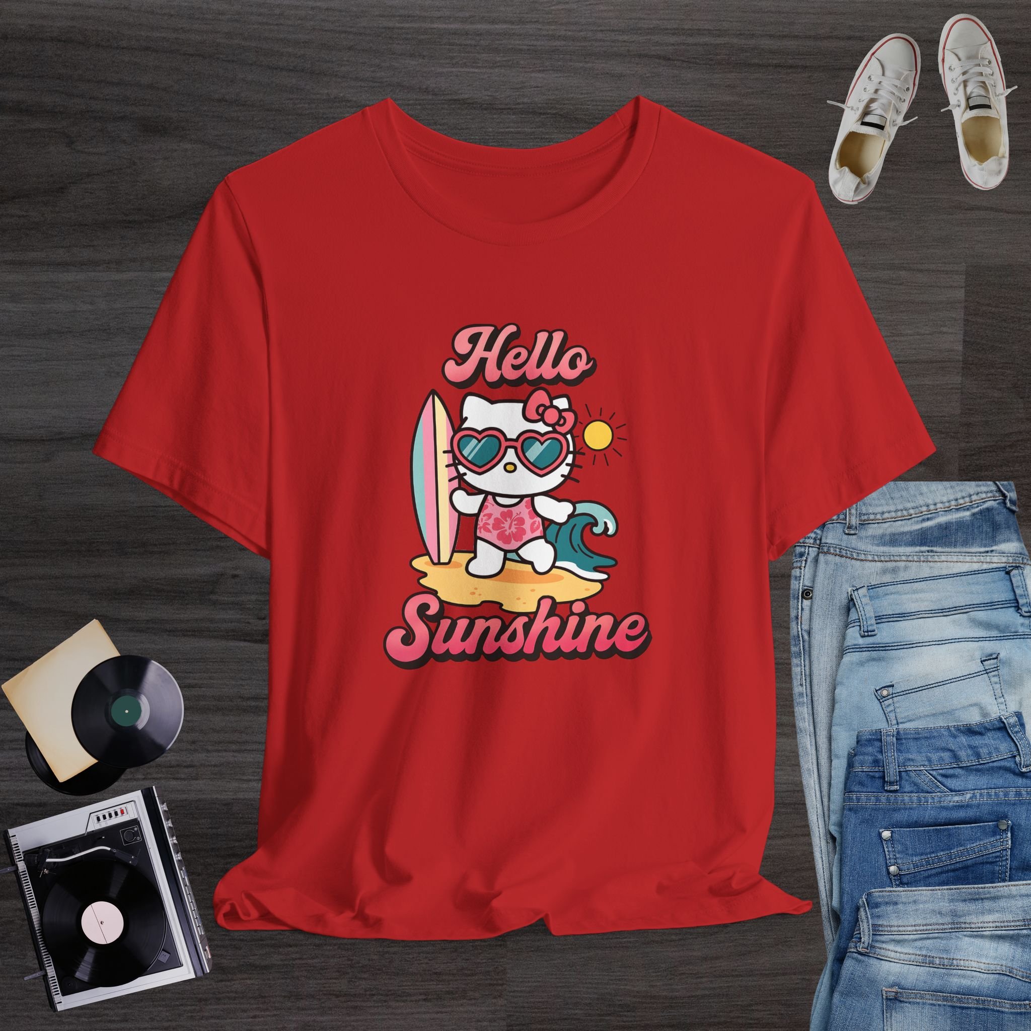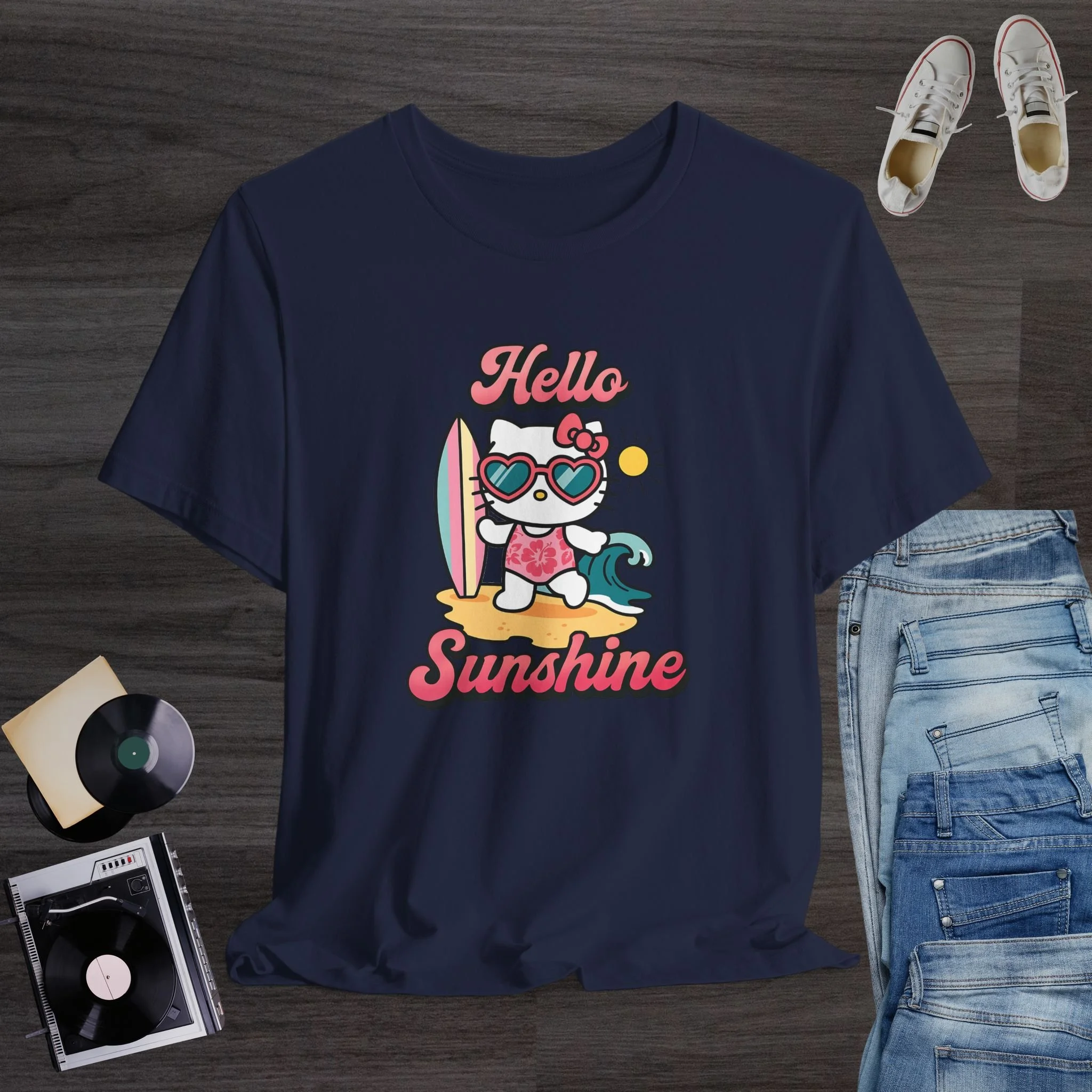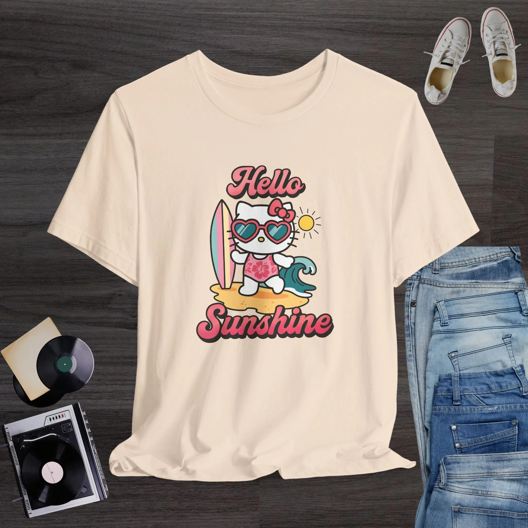 Hello Sunshine Surfer Kitty T-Shirt | Cute Summer Beach Kitty Graphic Tee
