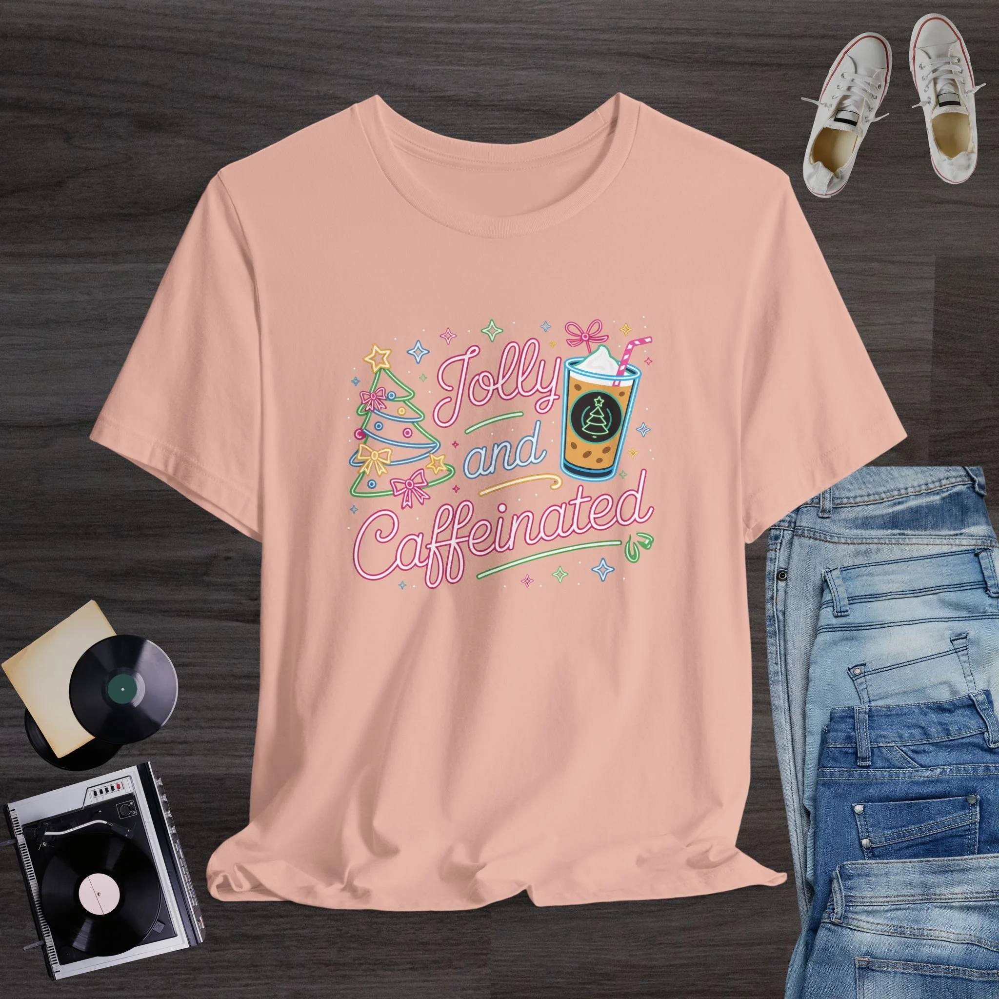Jolly and Caffeinated Christmas T-Shirt | Festive Coffee Lover Holiday Graphic Tee
