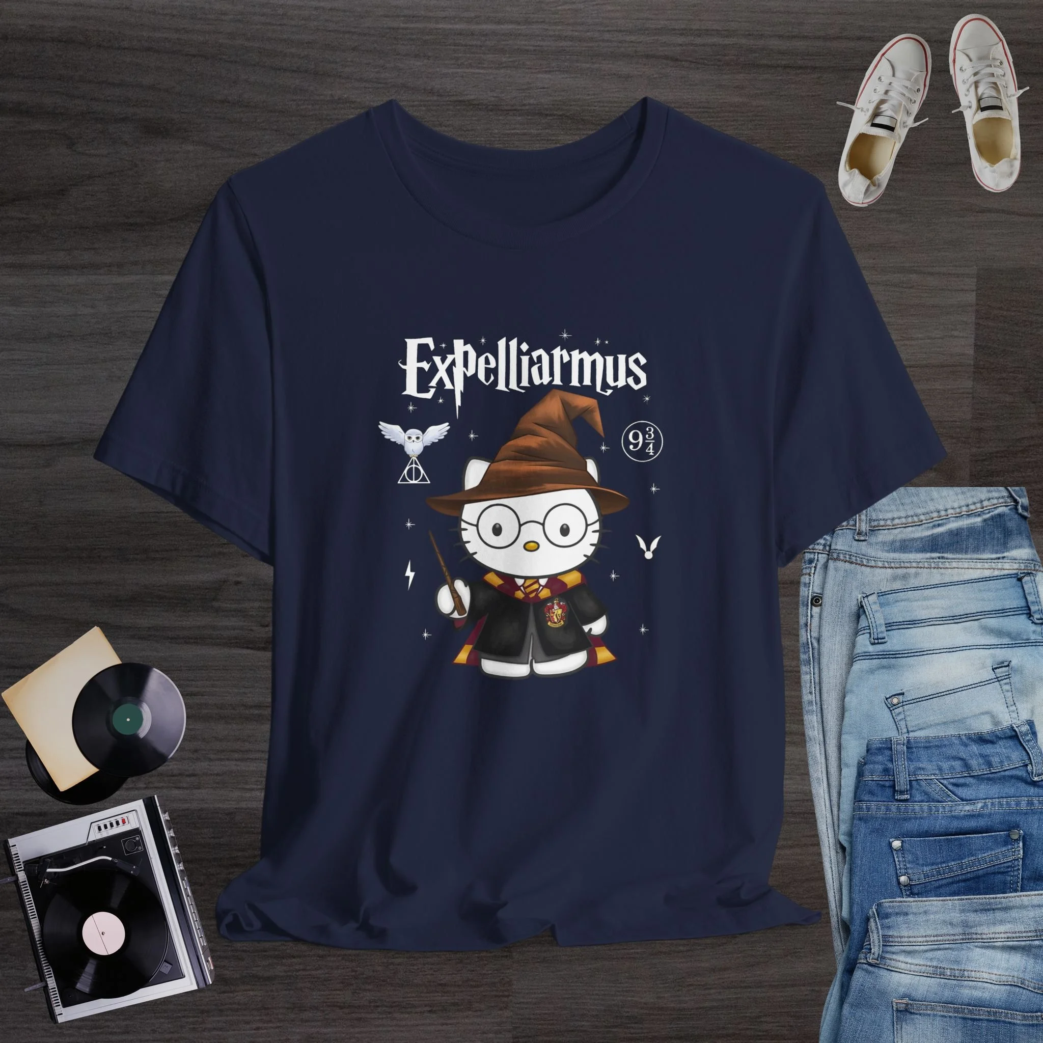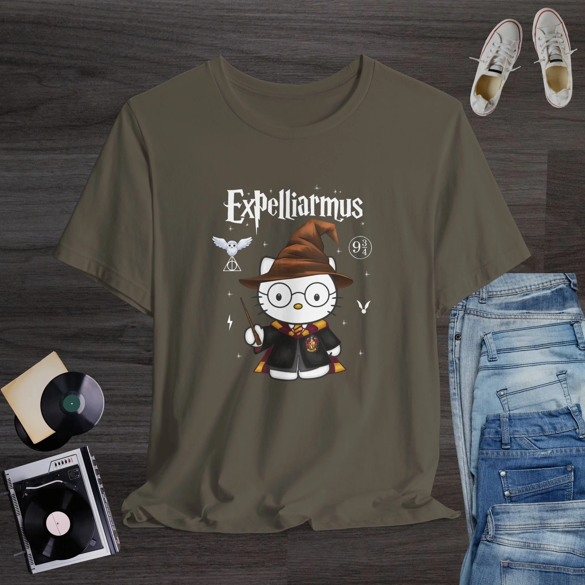 Kitty Wizard Parody T-Shirt | Kitty Spellcaster “Expelliarmus” Magic School Tee