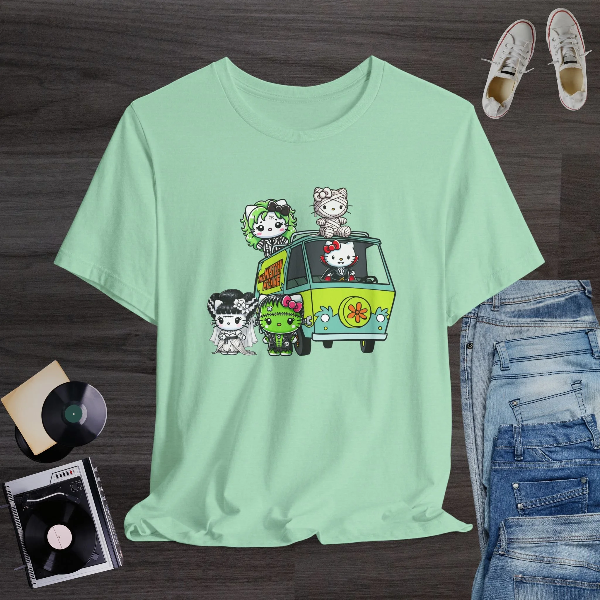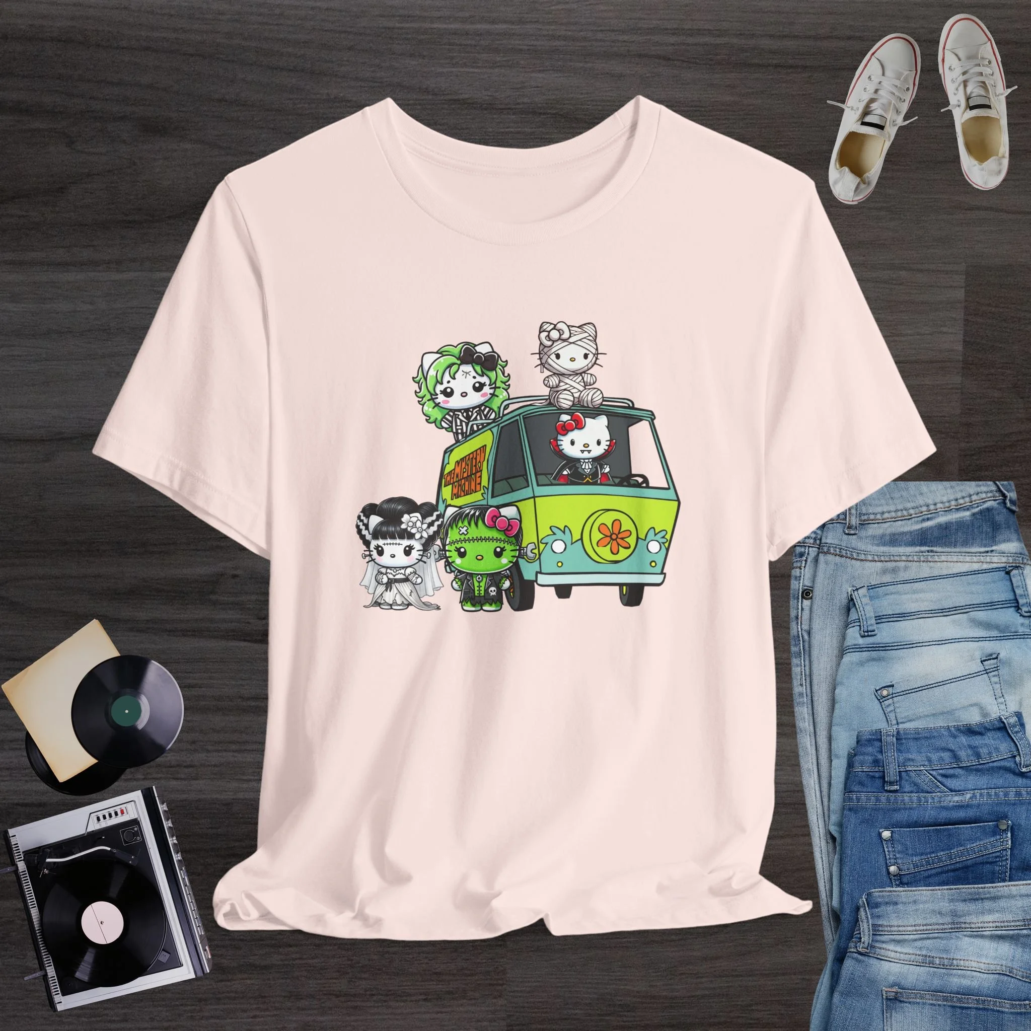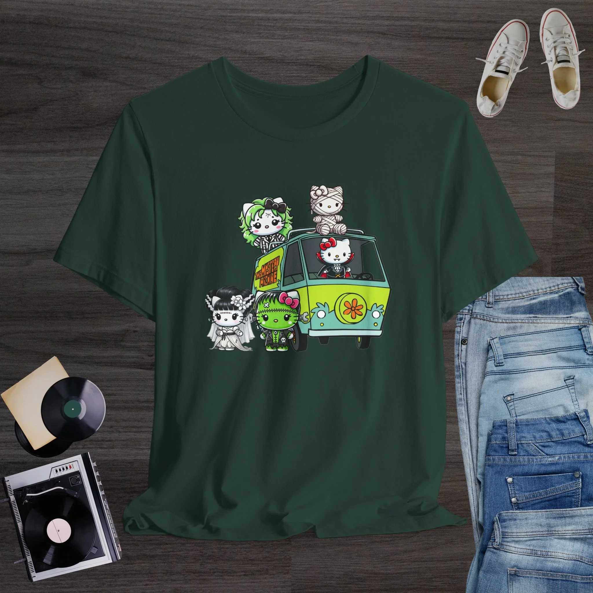 Get ready for spooky-season cuteness with this adorable kitty crew T-shirt! This design features a group of cute monster-themed kitties riding in a colorful mystery-style van, blending Halloween vibes with kawaii charm. Perfect for fall outfits, haunted events, trick-or-treating, or anyone who loves fun, playful spooky graphics. Ideal for horror fans who prefer cute over scary, collectors of themed kitty art, and anyone wanting a unique graphic tee for autumn. Soft, vibrant, and eye-catching—this shirt is a festive must-have.