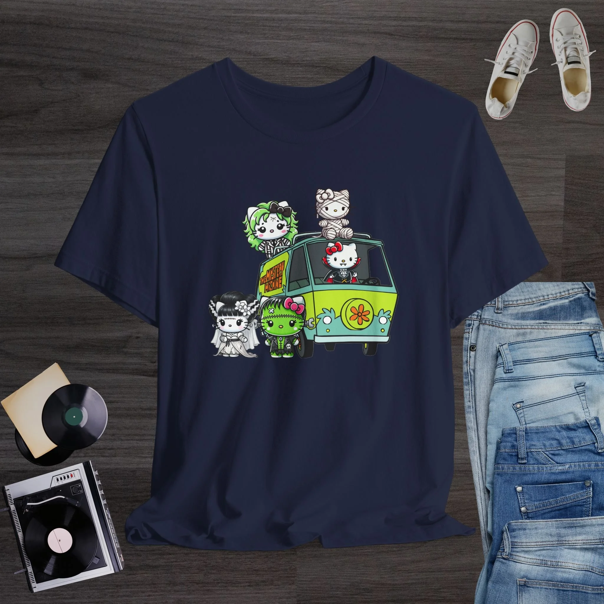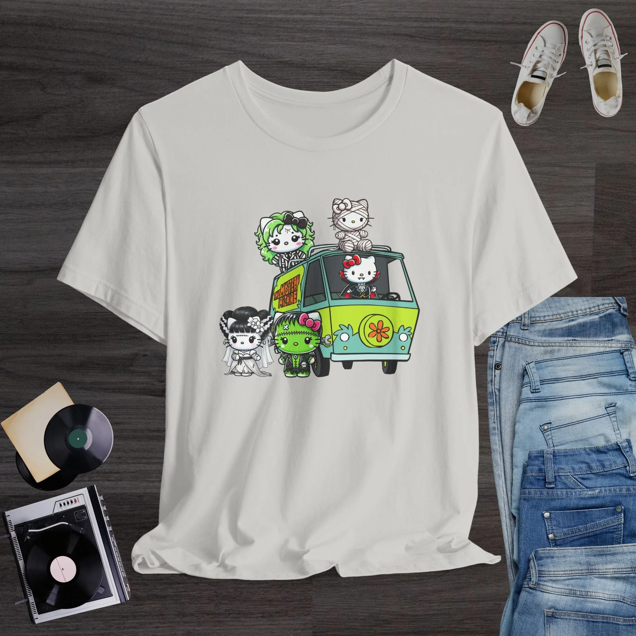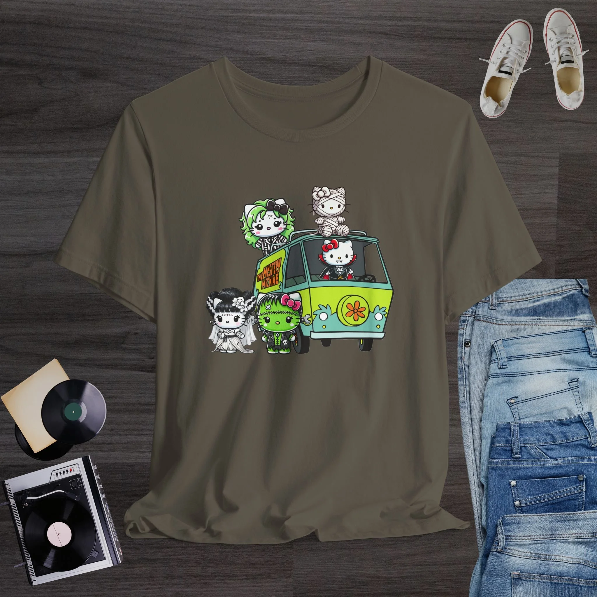 Get ready for spooky-season cuteness with this adorable kitty crew T-shirt! This design features a group of cute monster-themed kitties riding in a colorful mystery-style van, blending Halloween vibes with kawaii charm. Perfect for fall outfits, haunted events, trick-or-treating, or anyone who loves fun, playful spooky graphics. Ideal for horror fans who prefer cute over scary, collectors of themed kitty art, and anyone wanting a unique graphic tee for autumn. Soft, vibrant, and eye-catching—this shirt is a festive must-have.