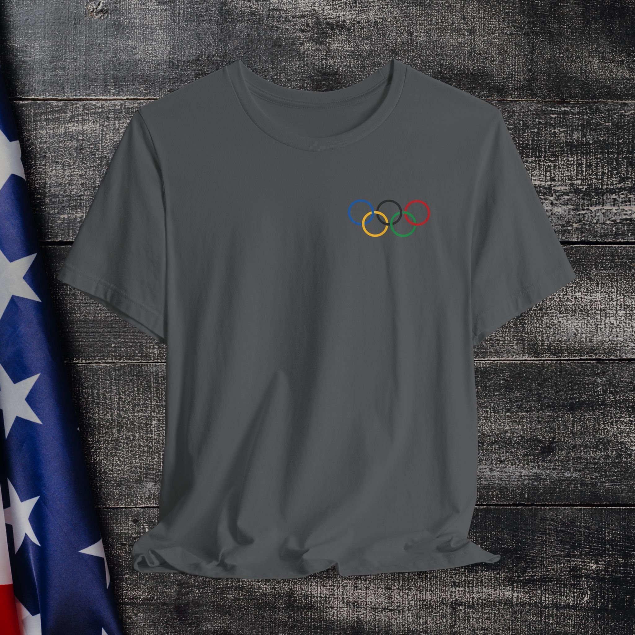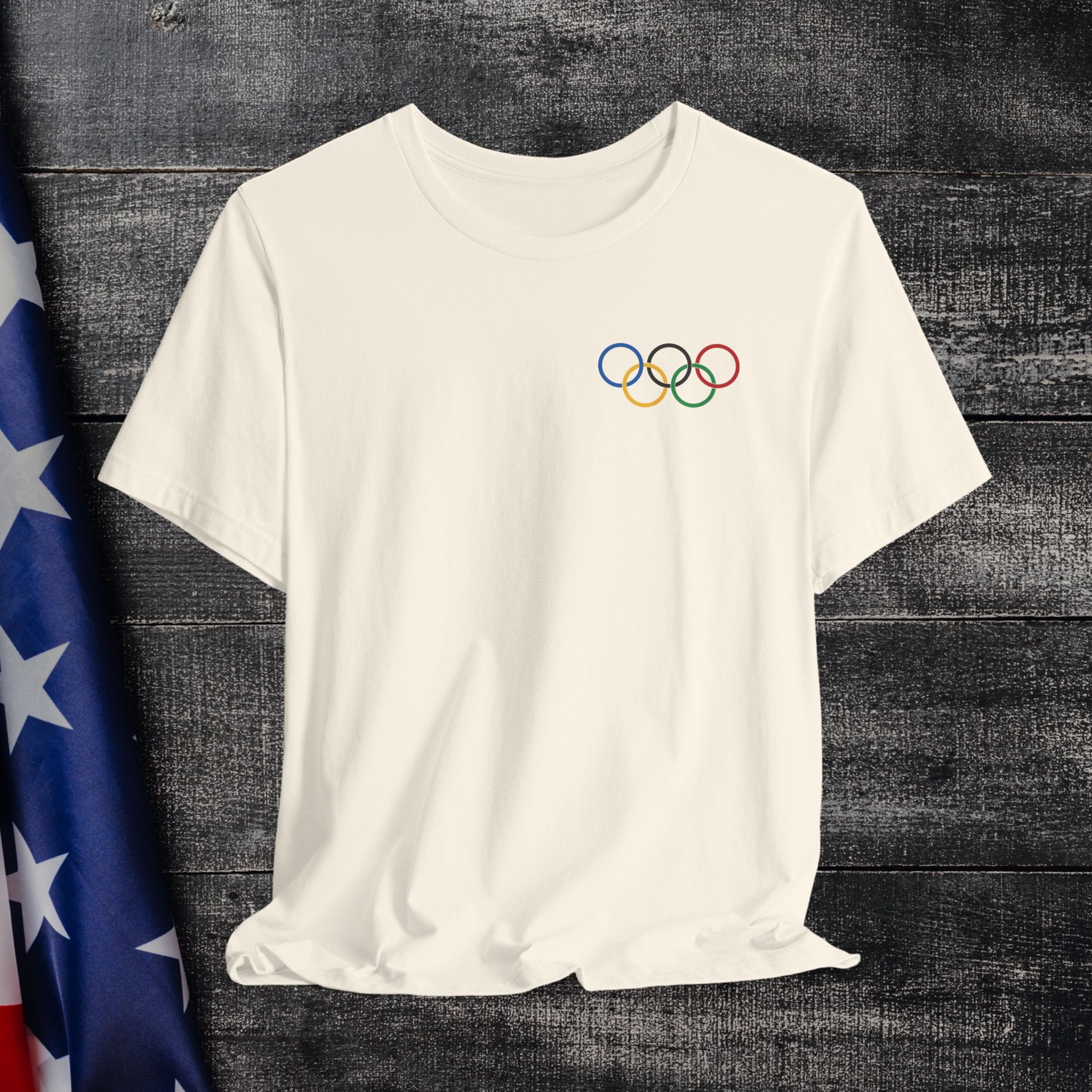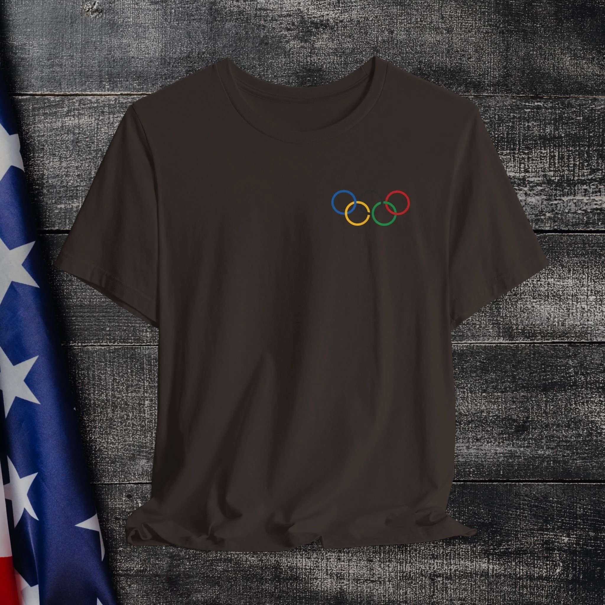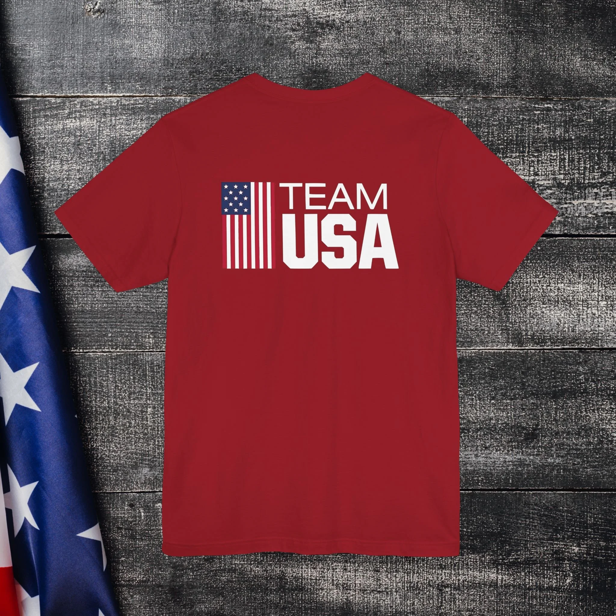 Team USA Olympic shirt with front chest logo and bold flag back graphic. Perfect for Olympic fans, patriotic outfits, and USA pride wear.