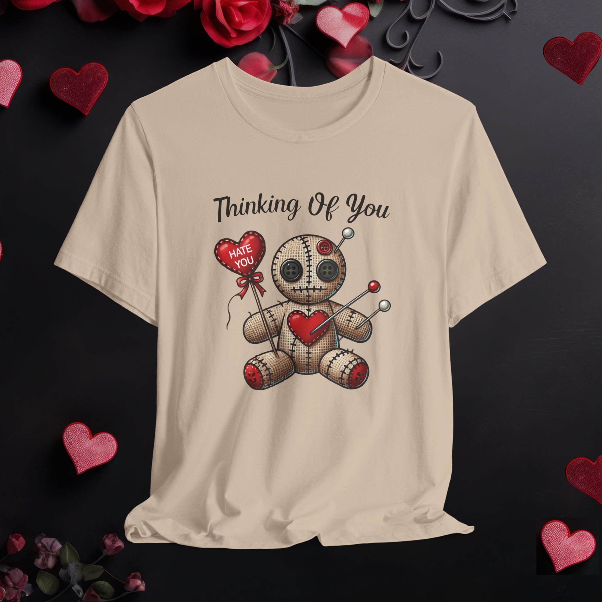 Funny anti-Valentine shirt featuring a voodoo doll graphic and “Thinking of You” text. A dark humor Valentine tee perfect for sarcastic gifts.