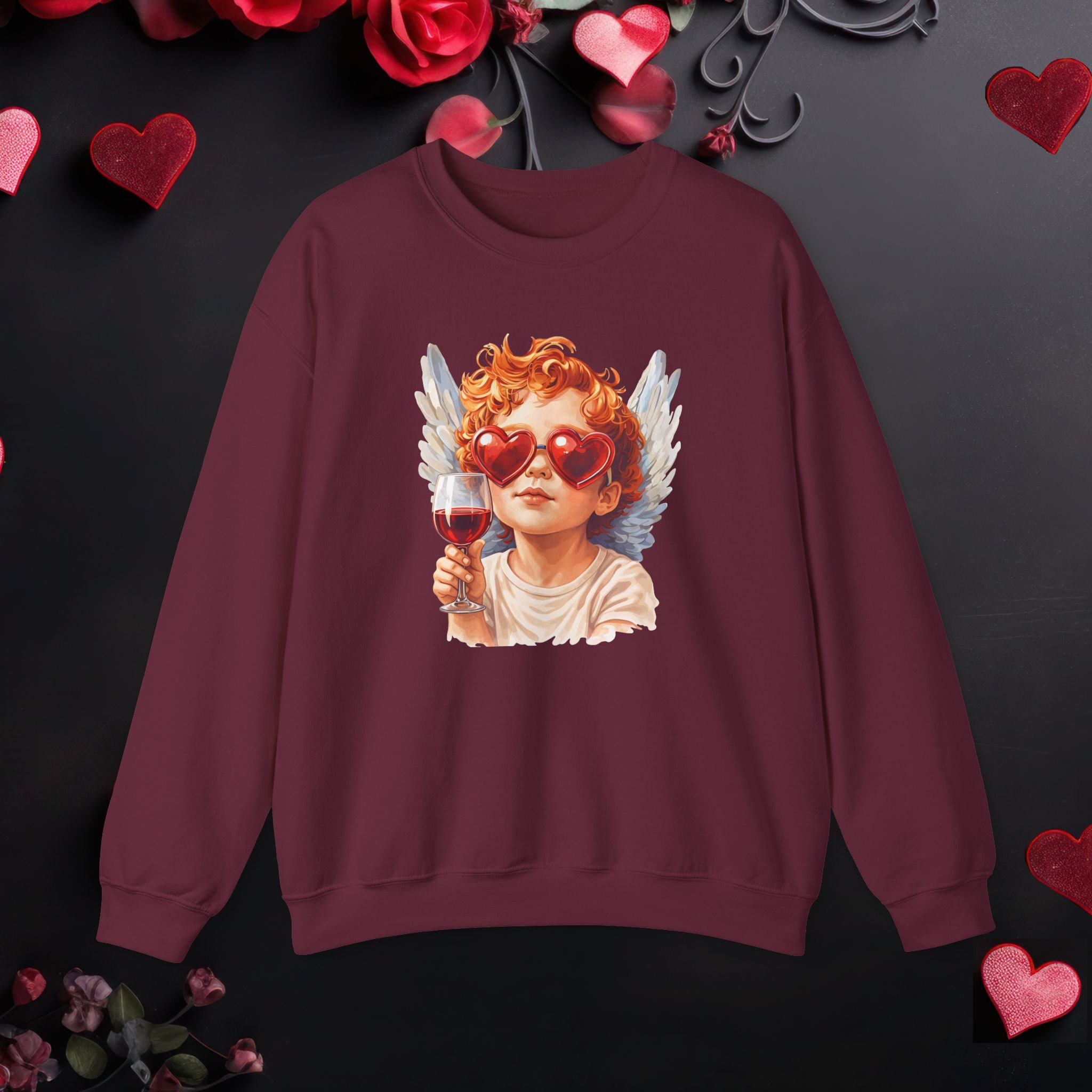 Valentine Wine Cupid Sweatshirt – Angel Heart Sunglasses Graphic Sweatshirt